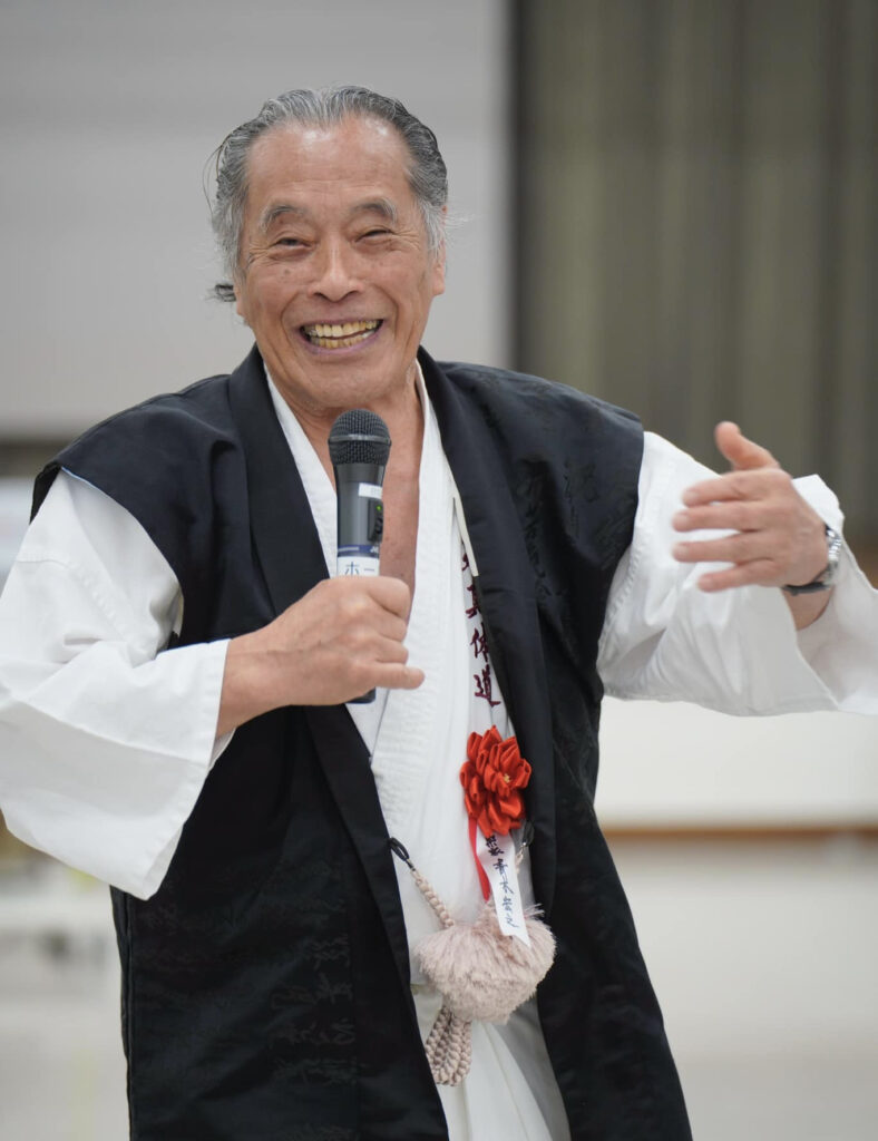 A week after the gasshuku, the 60th Anniversary Celebration was held in Yokohama. It was attended by about 100 people who have been involved in Rakutenkai, Shintaido, and Tenshinkai during the past 60 years. Aoki Sensei’s personal friends gave heartfelt speeches to congratulate the organization. The highlight of the event was a presentation that combined demonstrations of Shintaido and Kenbu accompanied by a narration recounting 60 years of Shintaido history. Archival photos and videos were projected on the back wall during the performance, integrating past and present. The performers represented several countries, showing how the movement has spread throughout the world and touched people’s hearts.