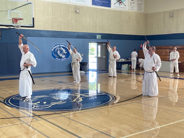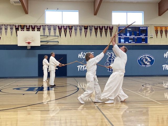 Organizers Connie Borden, Robert Gaston, and Lee Ordeman welcomed participants from both the east coast and the west coast of the USA. Lee, as team leader of the service teams, set the tone of joint collaboration to connect with each other and provide a sense of shared community. Sandra and Sally provided nourishing on-site lunches which served to keep us in community each day of Keiko. Martha, assisted by Dan and Gorazd, did sensei care to ensure our instructors were warmly cared for and allowed instructor’s Pierre, Connie, and Rob to share their lived wisdom from their practice of Kenjutsu. Jennifer, assisted by Laura and various students, did hakama care. Sarah videotaped the six-Keiko to give us a record for future studies. Mike assisted by Bevis,  helped prepare the dojo space and ensured the needs for safety and comfort were met as the dojo team. Tom and Jason kept the group informed throughout with timely announcements, including use of WhatsApp. Robert was the facility liaison for smooth and clear communication with facility staff.